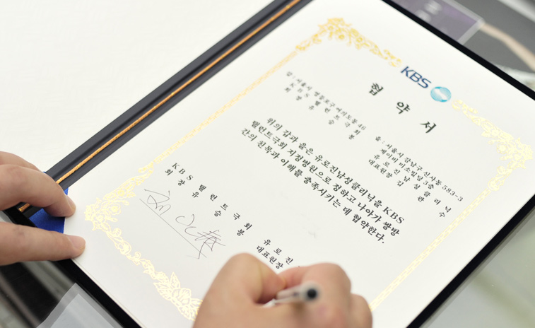 KBSÅÅ·±Æ®±ØÈ¸ ȸÀå°ú À¯·ÎÁø ³²¼ºÀÇ¿ø ´ëÇ¥¿øÀå´ÔÀÌ Çù¾à¼¸¦ µé°í ÇÑÄÆ Âï¾ú½À´Ï´Ù.