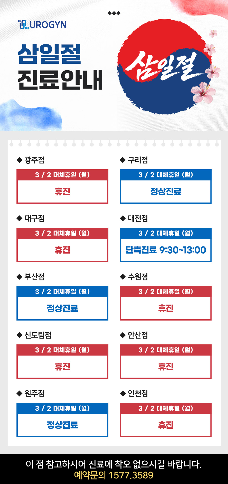 Á¦¸ñ 3¿ù 2ÀÏ »ïÀÏÀý ´ëüÈÞÀÏ Áø·á ¾È³»µå¸³´Ï´Ù.